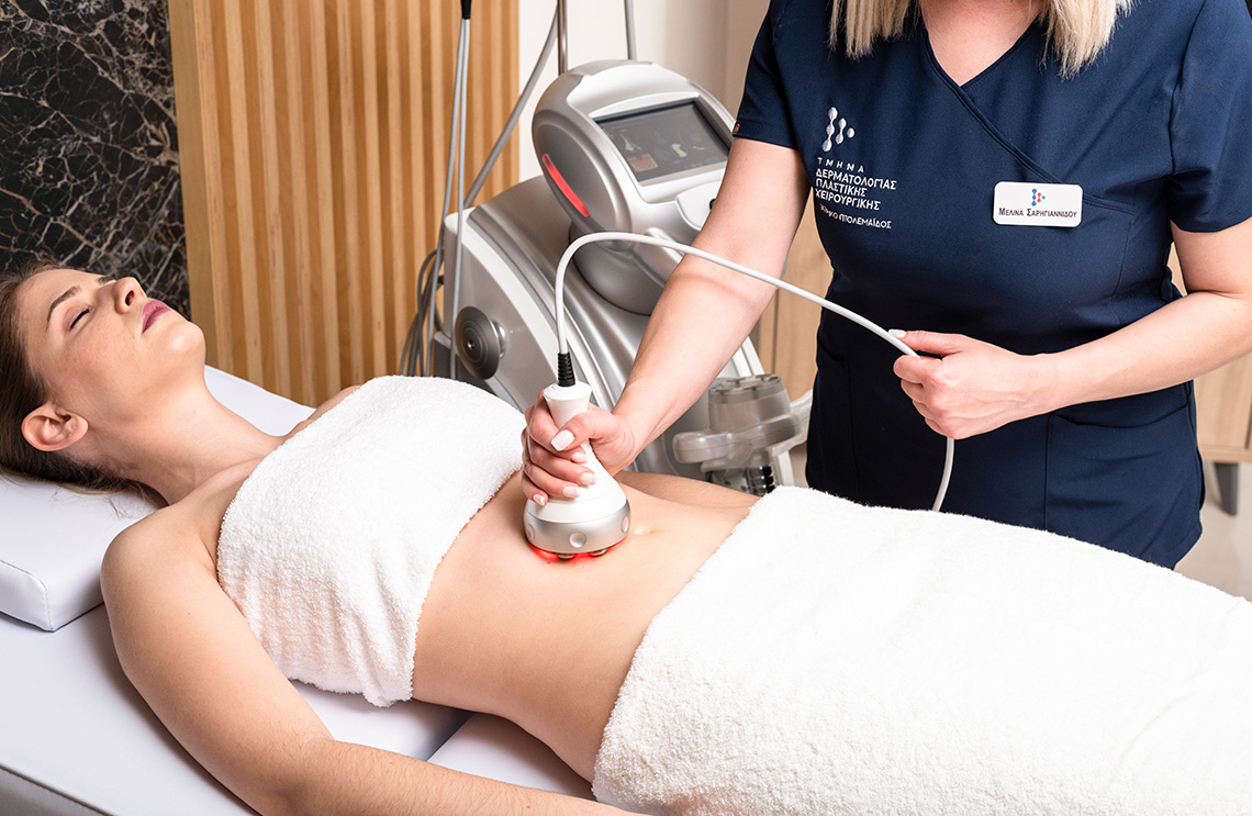 Lipolysis – Firming – Treatment of Cellulitis Responsible Physician Dr. Katerina Kyriakou Dermatologist - Venereologist As we age, the skin and muscles of the body lose their elasticity and begin to relax. This phenomenon also occurs at younger ages, usually after weight loss, without the simultaneous exercise. The remodeling of the silhouette, the loss of weight and the improvement of body imperfections can now be achieved without surgery, painlessly and with absolute safety.In our clinic, we can offer a comprehensive treatment of local fat, sagging and cellulite, with the unique multifunctional platform 3-MAXPLUS. 3-MAXPLUS integrates 3 leading technologies Cavitation, MultipolarRF and VacuumRF. It is the most complete and permanent, non-invasive method of liposculpture, which can provide a solution to any aesthetic repair of the face, neck and body.What is Cavitation and how does it work? Ultrasound lipolysisCavitation is a modern technology of focused ultrasound of a specific frequency that causes the reduction of the volume of fat cells and the liquefaction of the fat contained in them (lipolysis). It is proven to be the only non-invasive technique with such immediate and visible results, from the very first session. It is indicated for the destruction of fat cells in any area with excess fat, the treatment of cellulite, and body liposuction.Ideally, it is combined with mechanical lymphatic massage (VacuumRF) and with radio frequencies (MultipolarRF). Additional help in this process is the consumption of a lot of fluids, so that we can achieve a better elimination of toxins, as well as physical exercise.How multipolar radio frequencies (MultipolarRF) work Multi-level tighteningRadiofrequency body treatments intervene dynamically and bloodlessly. They heat the skin on many levels, causing intense regeneration of collagen and elastin, resulting in firming, improving sagging skin and reducing spots. It is characteristic that when they act in deeper layers they also increase the metabolism of fat cells.The powerful RF heads of 3-MAXPLUS impress with the effect they give on tightening, reducing volume and improving skin texture. The results are long-lasting and the improvement continues even after the application is over. Radio frequencies can be combined with cavitation and VacuumRF lymphatic massage for even better results.MultipolarRF treatment is fast, painless and provides the sensation of a warm massage. It is ideal for any skin type and at any time, as it does not cause photosensitivity, redness or any other symptom.What is the effectiveness of mechanical lymphatic massage (Vacuum RF)? Comprehensive decongestionAccording to estimates, over 90% of women have cellulite, and it doesn't just appear in those with increased body fat. 3-MAXPLUS exercises continuous suction – compression with lymphatic massage, empties fat cells by reducing their volume and achieves multi-level tightening. Its powerful rhythmic suction is adjustable and increases the rate of lymphatic circulation, reducing fluid retention and rejuvenating skin cells.Vacuum RF treatment has proven effectiveness in cellulite and localized fat, while at the same time "sculpting" the body. It is also recommended for women who have just given birth, but also for menopausal women who have retention due to hormonal disorders. 3 MAX Plus